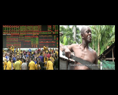Boulos decided to focus on one of the most important commodities, oil and its ‘two end points, production and distribution’. He travelled to Nigeria and the Niger Delta, one of the most important oil producing regions on the continent of Africa and filmed Movement for the Emancipation of the Niger Delta (MEND). The Niger Delta is noted for its extreme poverty in spite of the region’s oil wealth and the miltant group seeks to redistribute that available wealth. Subsequently, Boulos then filmed at the Chicago Mercantile Exchange, one of the largest commodity exchanges in the world and which trades in commodities including oil futures.