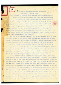 Many things has been misrepresented to her after they got there, she found that all the children, whose fare had been paid by the company, had to work all the time. The younger children worked some and went to school some, but they worked regularly as soon as they were able to stand up to the benches. “We lived xxx in rough shanties. It’s no place for children. They learn too much”. They had to furnish their own food and their fares were taken out of their earnings little by little. They didn’t get ahead any financially although it was a good year, at this place. “Call this slavery!” she said. (original delete marks, Hine 1909: 3)