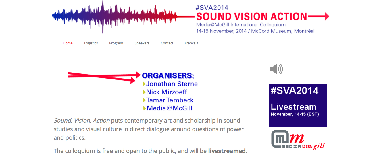 This international colloquium has been convened by Prof. Jonathan Sterne (McGill), Prof. Nicholas Mirzoeff (New York University) and Dr. Tamar Tembeck (McGill) with the intention to: