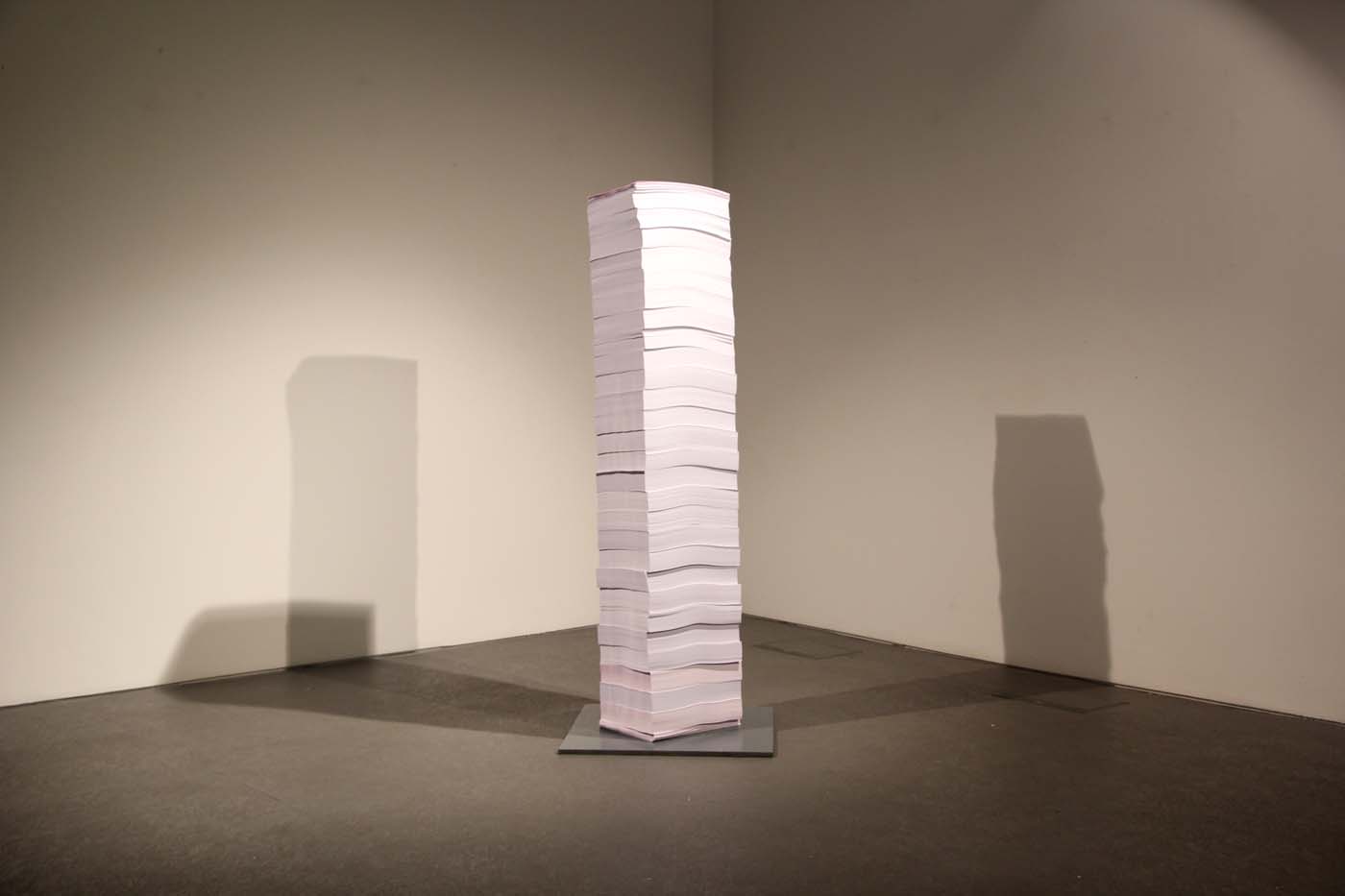 The installation image below shows the 6 feet high stack of A4 paper also titled The Normalisation of Deviance as part of the installation. This equates to the findings by a Chicago-based researcher of the number of global positions taken through the use of algorithms on one stock in one nanosecond. The total was 14,000 and equates to this amount of paper if this data was printed out. On the pages facing up is the quote: