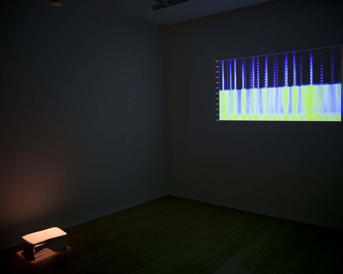 The image above of part of the installation titled The Normalisation of Deviance shows Spectrograms, a moving visual representation of the soundscape of the installation. The soundscape has been generated through the data generated through the use of an algorithm to identify how often the Irish Minister for Finance has used the word Market or Markets in his public speeches since taking office.